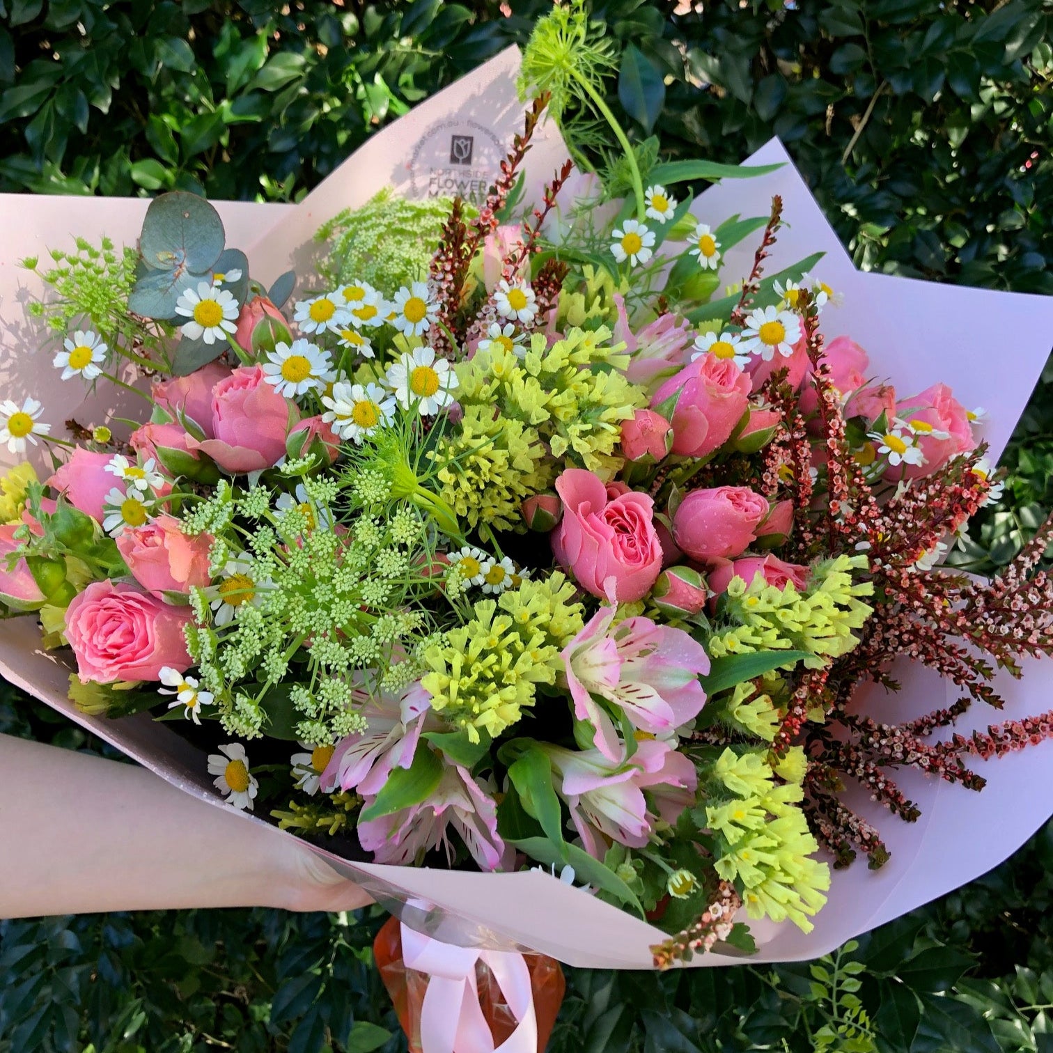 The gorgeous design features seasonal filler flowers and petite blooms.