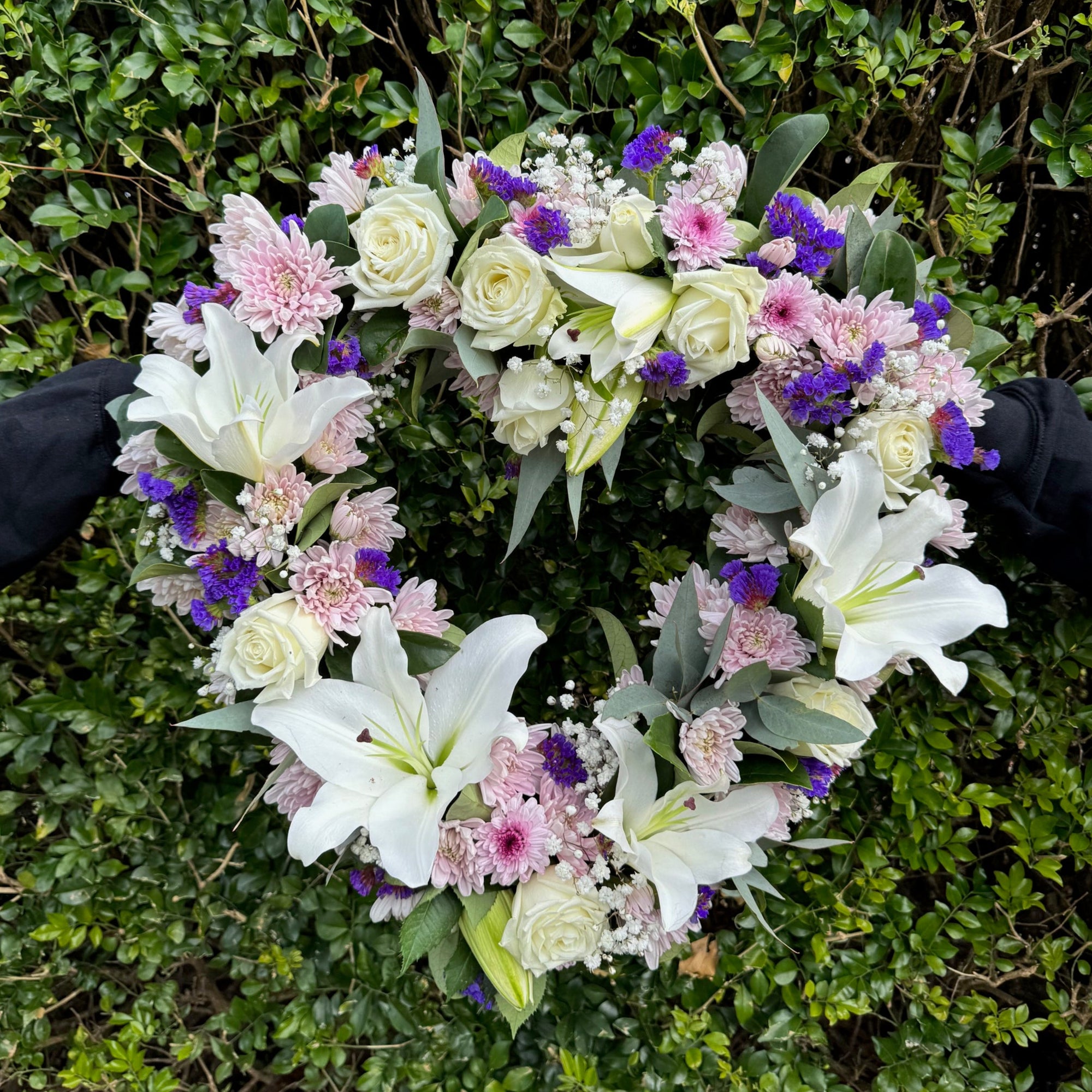 A floral tribute made with seasonal blooms in shades of purple and white.