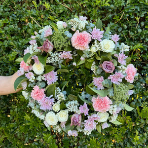 A floral wreath made on a 36cm base. Can be created in various colours & can accompany our ceremony arrangements (pictured). Please contact us for custom colour choices.