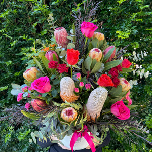 Front facing ceremony arrangement made into a white ceramic pot featuring seasonal native blooms, bright roses and foliage.