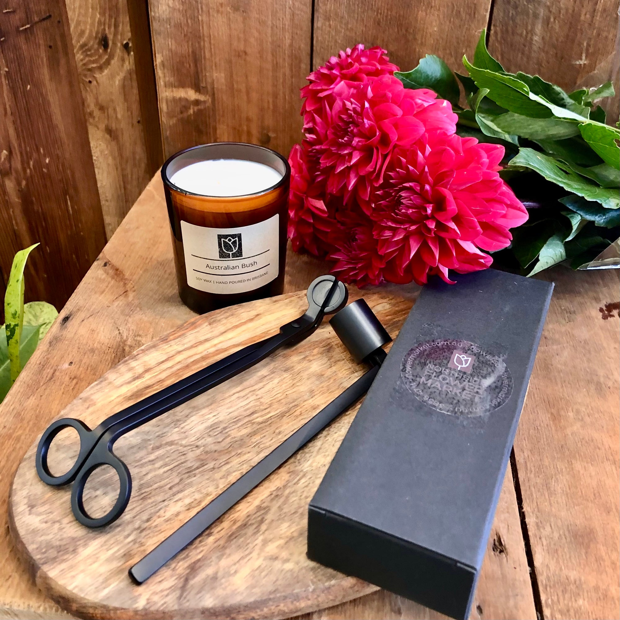 A wick trimmer and snuffer set in a matte black design. Trimming the wick ensures a clean, even burn and longer candle life. The snuffer quickly extinguishes your candle without creating smoke and soot.