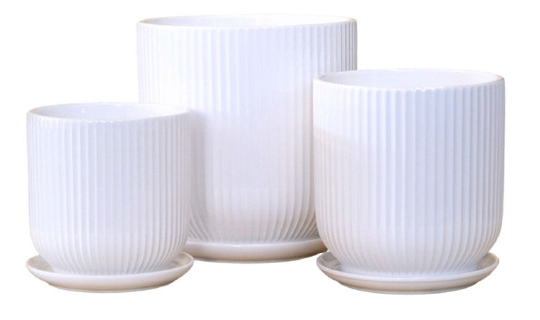 A glazed, U shaped ribbed pot, with a drainage hole and saucer.