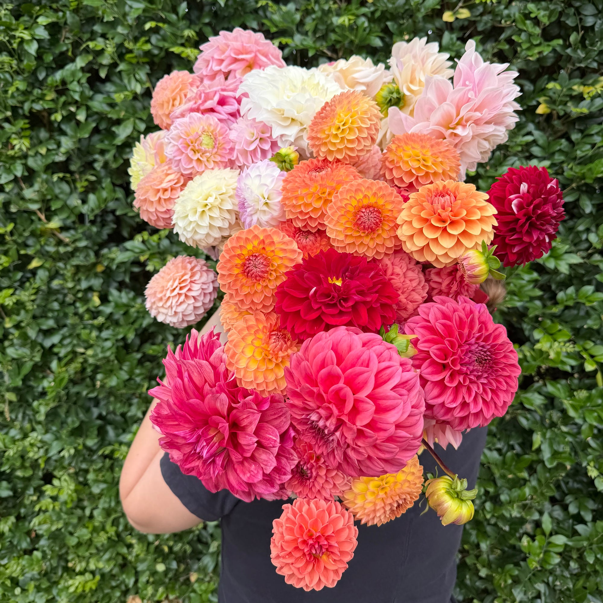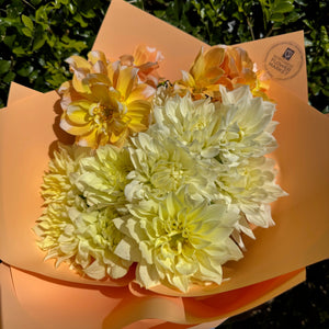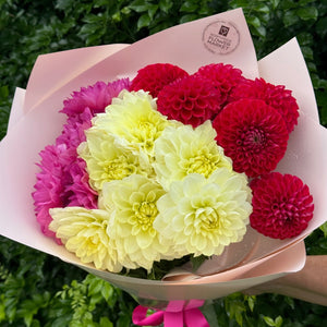 Beautiful bunches of locally-grown dahlias with their amazing petal structure, in a simple gift wrap.