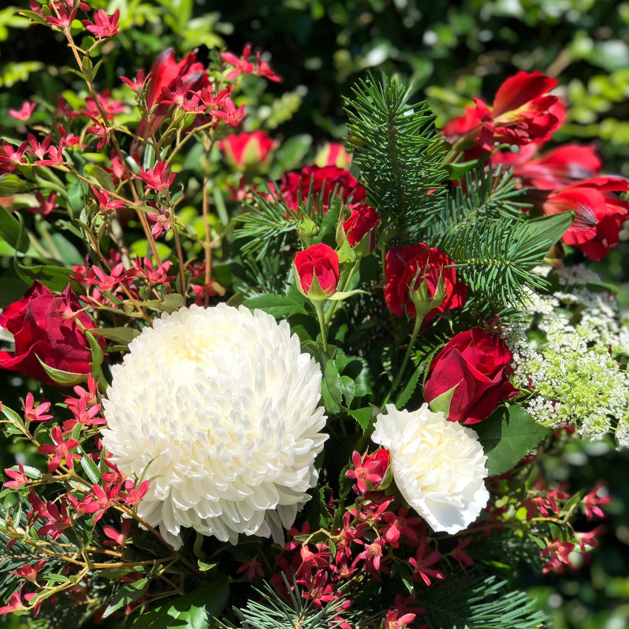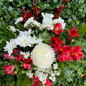 Front facing design in a mason jar featuring blooms in shades of red and white with matching festive foliage.