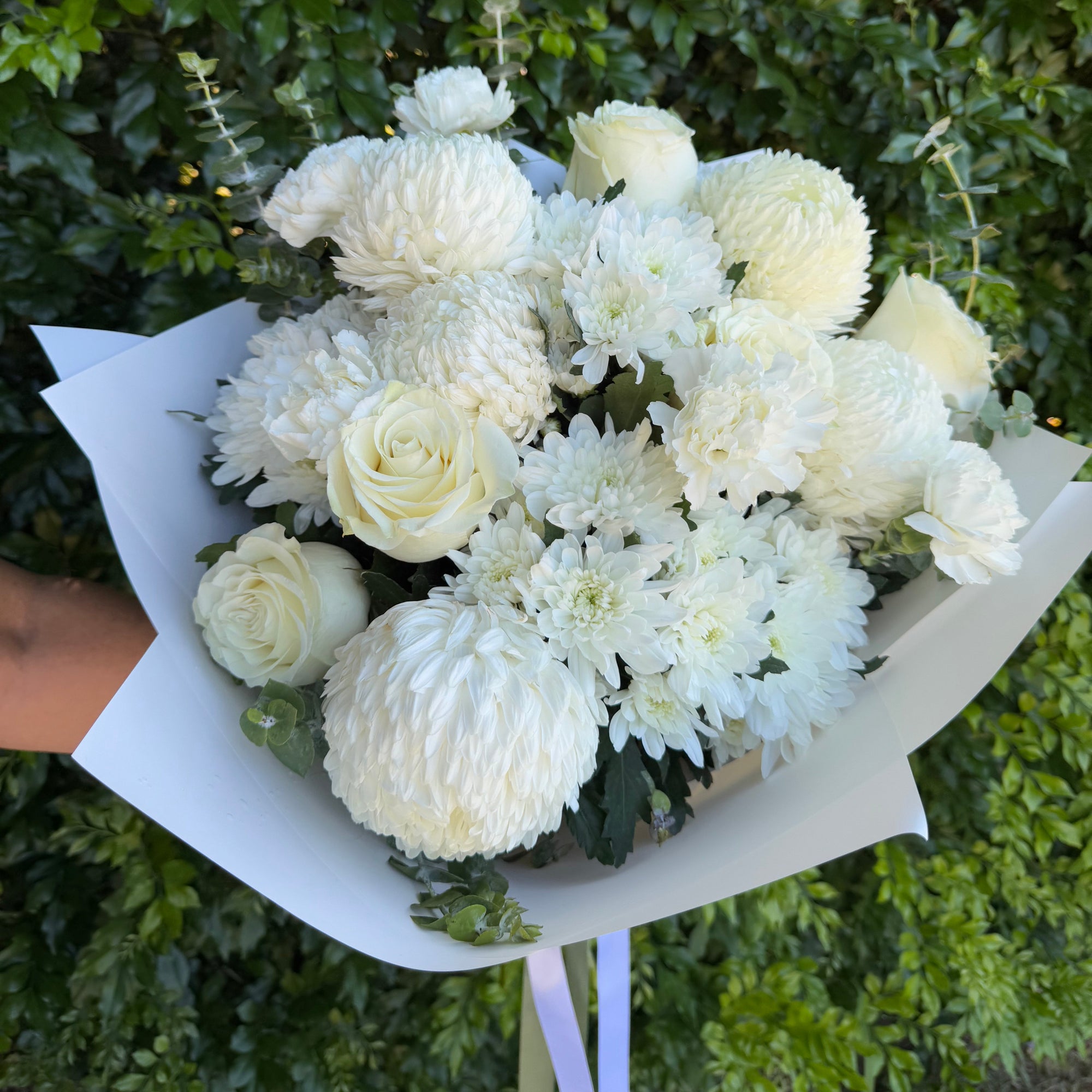 Brighten someone's day with our deluxe Pom Posy! Each bouquet is hand-made with love and includes roses, Pom chrys, carnations and a variety of seasonal blooms and foliage. Tied with a charming bow, it's the perfect floral gift.