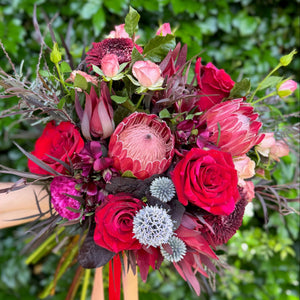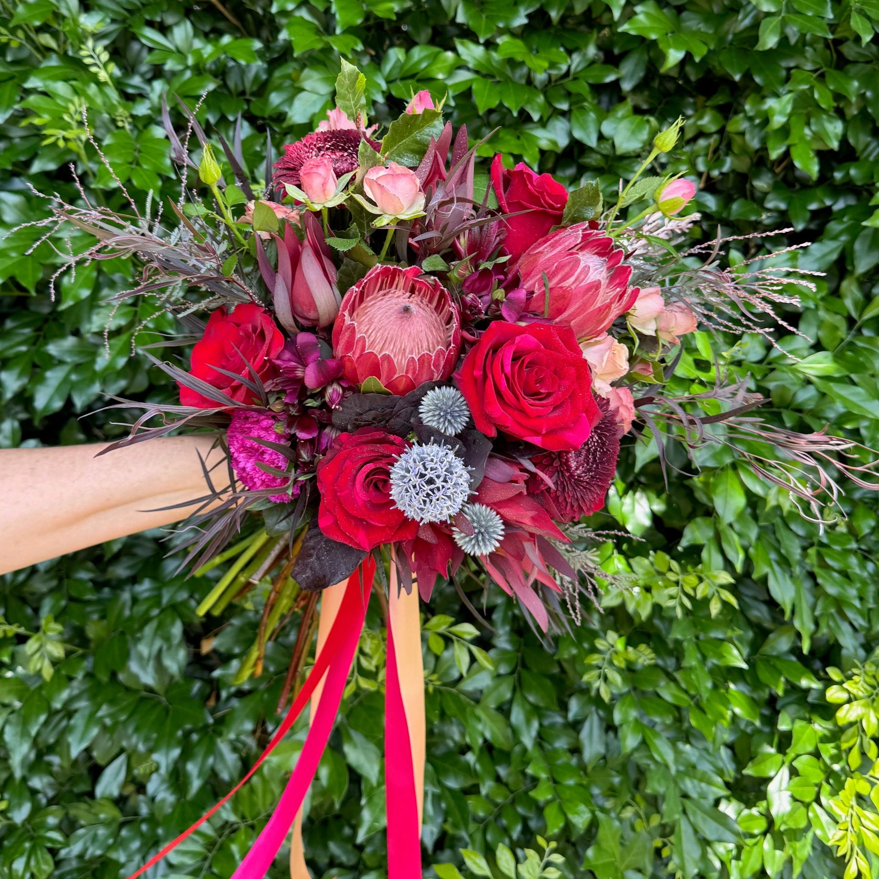 This beautiful dark and moody bouquet will have heads turning in shades of red, burgundy, purple and a hint of peach/blue.